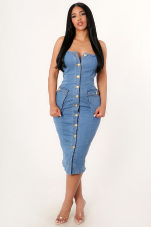Button Down Strapless Bodycon Midi medium Denim Dress