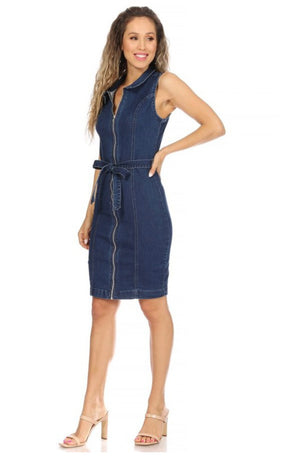 Dark Blue zip up sleeveless denim dress with collar and waist tie
