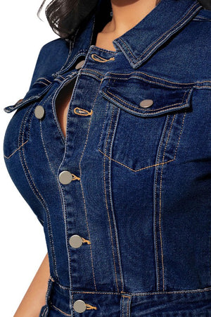 Fashion denim dress, short sleeve, spread collar, chest button flap patch pockets, coin pocket front scoop pockets, back patch pockets.